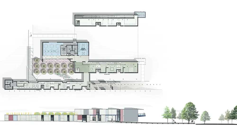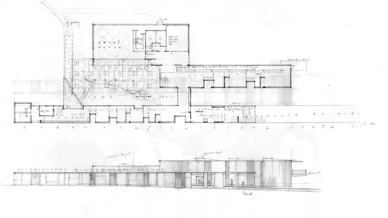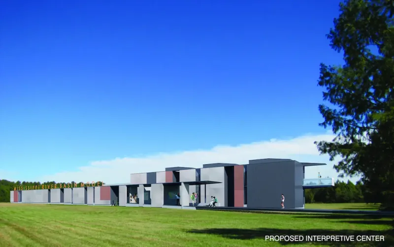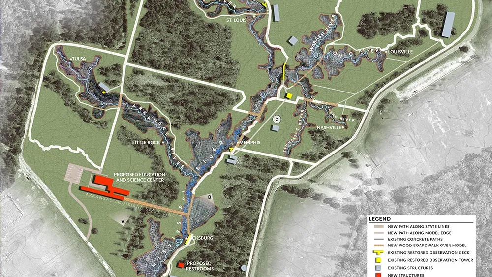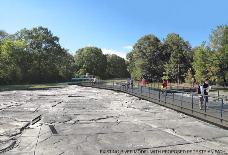 The design for the site and visitor center at the Mississippi River Basin Model is inspired by the site, construction, and form of the River Basin Model itself. The model exhibits an amazing combination of the natural power of water on our national geography and man’s ability to understand and tame this force for a mutually beneficial and stable relationship. This endeavor brought diverse people and talents together to build an engineering marvel that represents a unique time in our national history and the understanding of our world. The Mississippi River Basin Model, Waterways Experiment Station is registered as a Mississippi Landmark site, and it is currently in the process of National Landmark Registration. The Model will be preserved and restored under the Landmark standards, and will become an interactive, educational site. The concrete model will be stabilized and existing pump houses and site artifacts will be preserved as educational nodes throughout the site. A portion of the model will be restored to operation as a display of the geological and hydrological engineering and cartography behind the model and its construction.