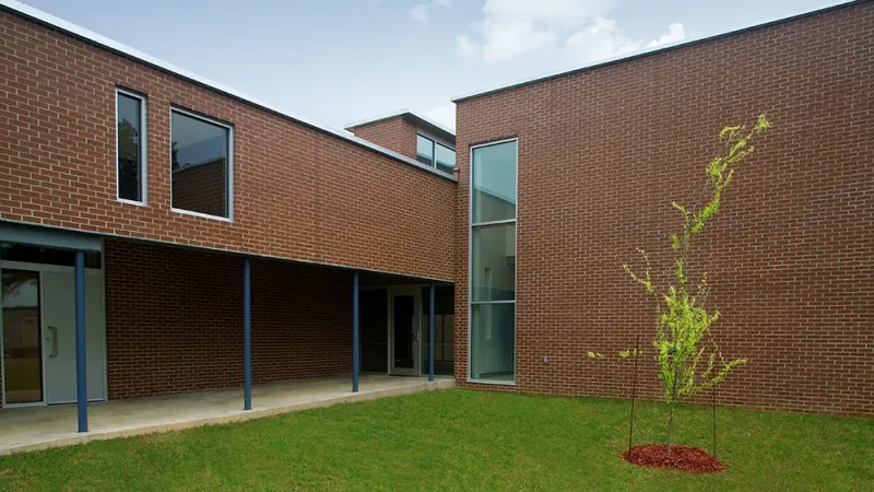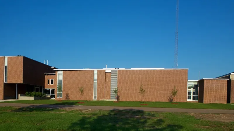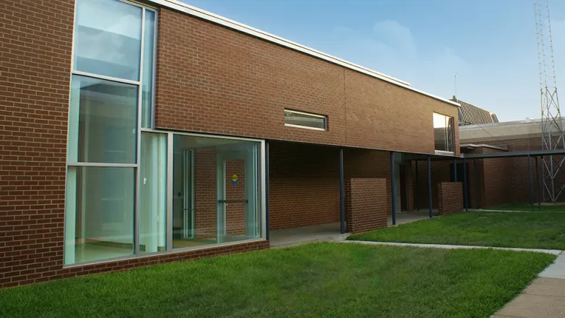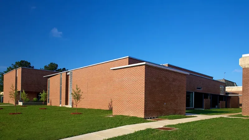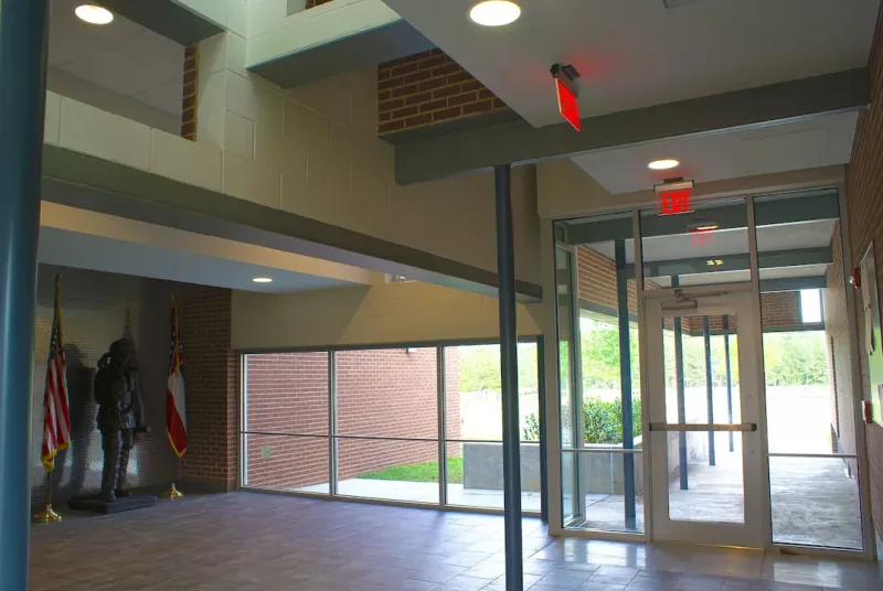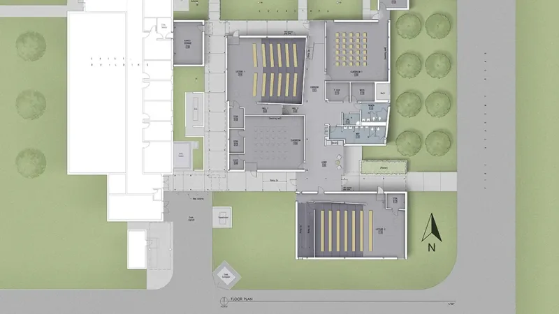 The New Classroom Facility consists of a straightforward program of two standard classrooms and two tiered lecture halls, all with the most current technology capabilities and related supporting spaces. The program spaces are arranged efficiently around a double-loaded corridor, with exterior finishes responding to those of the nearby existing Administration Building. The designated site, bounded on two sides by the Administration Building and on two sides by campus vehicular circulation, informed a somewhat square plan that capitalized on views to the grassy campus eastward and harder, constricted views oriented north and west. A new outdoor courtyard is created in the interstitial space between the existing building and the new classroom facility. The deliberate orientation of the building mass and the free circulation around the building provides direct access to the training fields for firefighter trainees. A complexity of natural light and structural elements, continuing and intermingling rhythms established the exterior porches, mark the intersection of corridors, and result in the synthesis of a lively main lobby.