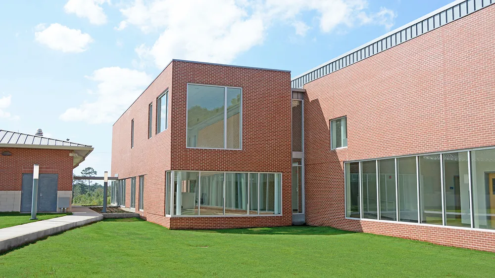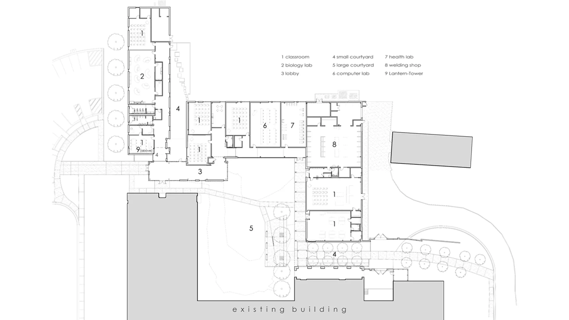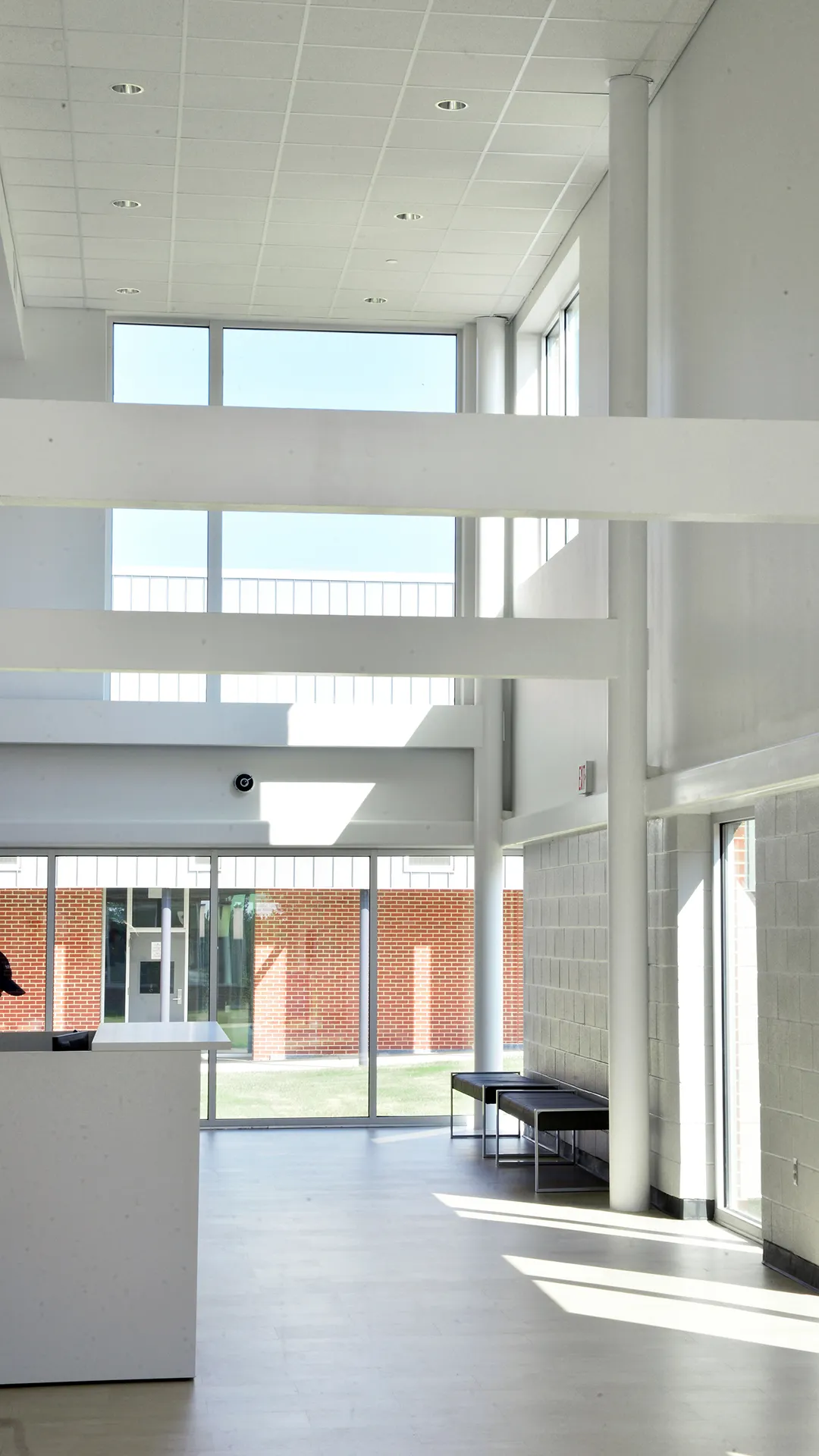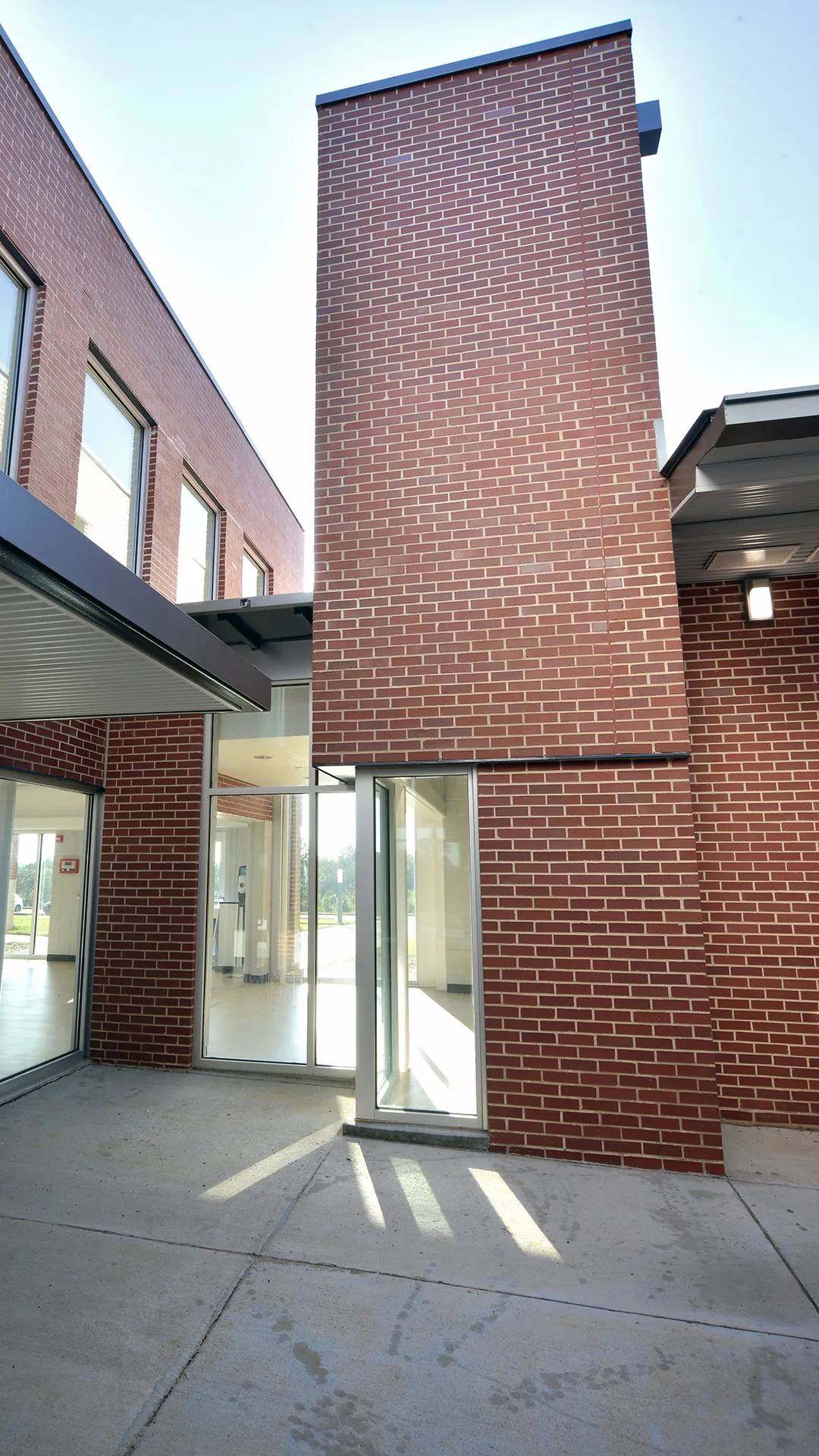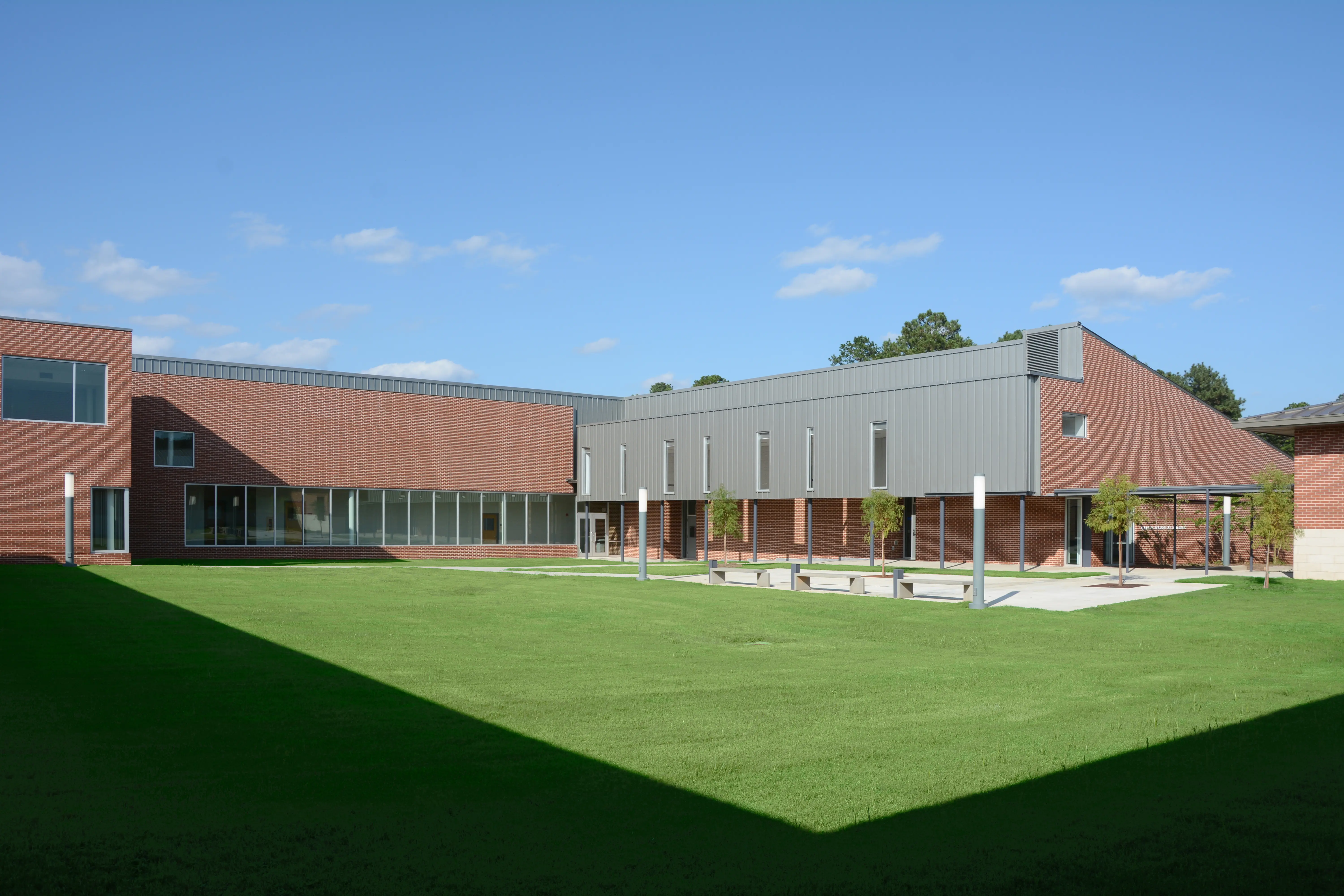 The New Simpson County Center Career Technical Building Addition expands a rural college building with classroom and technology/lab space organized as three wings around two courtyards. The southerly existing building conceals the addition from the campus entrance, in-forming new safe and inviting east and west entrances at rear of campus. A sunlit lobby at west side, and shops at east, anchor the plan, with layered screening cascading and directing the path from east parking. The new form, alongside existing north-reaching wings, creates a central courtyard negotiating steep existing grading. A secondary courtyard sits between west and north classroom wings, extended by an elevated lawn framing views to woods.