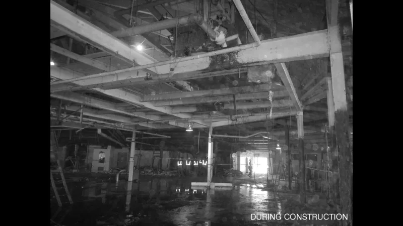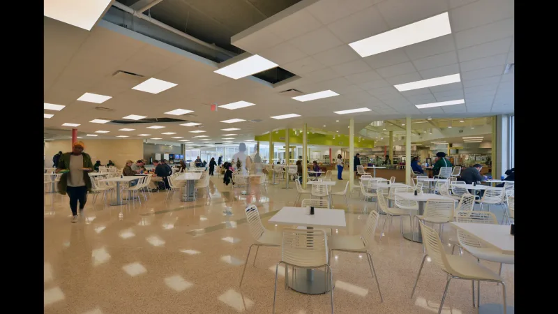 Though functional issues necessitated removal of much of the original building plan, the wonderfully-repetitive concentric rows of steel columns and radiating roof beams remained and were celebrated. The kitchen function was pushed back from plan center, allowing a food court below the dome. At the original kitchen footprint, a web of structural members within the dome braced the building and supported a mechanical mezzanine, concealed by the kitchen ceiling. These beams were exposed when the mechanical system was redesigned to floor level installations and were enlivened by a compressed ceiling over the original kitchen area - now the “food court” - and large vertical voids that extended to the underside of the dome’s roof deck were carved, “slicing” through the steel elements, resulting in a critical focal point within the original disorienting circular plan. Attic beams, columns, and these ceiling voids, are washed in light through a large skylight at the dome’s top, replacing an original kitchen exhaust. An original asbestos panel screen surrounding this exhaust was re-imagined as a stainless-steel armature with acrylic panels that were backlit with school colors.