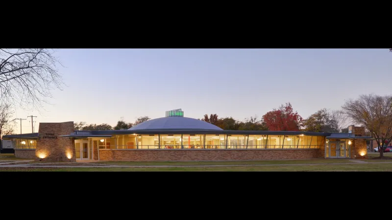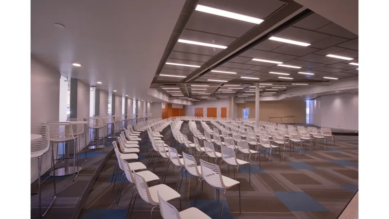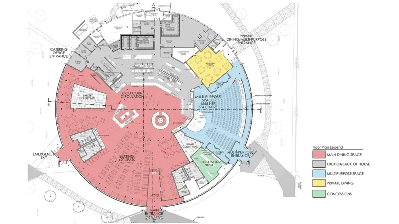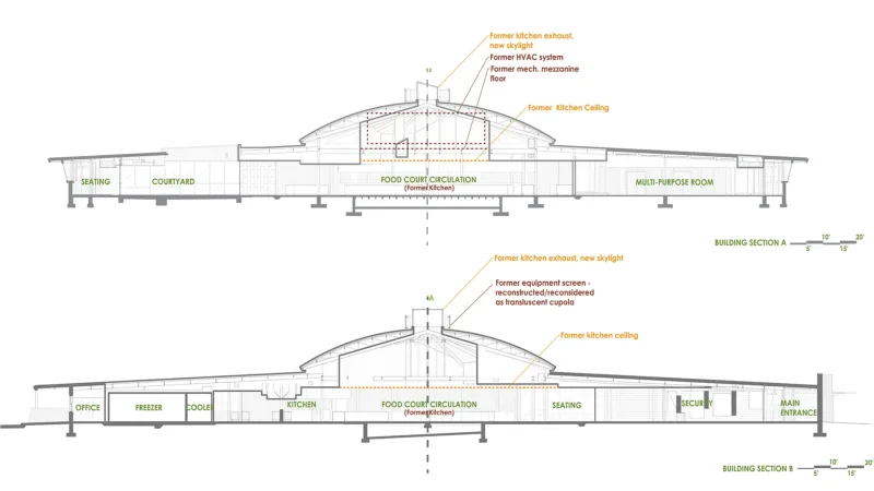 To improve day-lighting in the large, dark seating areas, two interior courtyards were introduced. These small courtyards, concealed from the exterior, serve as large lightwells to the more interior plan, providing transparency, layering, and programmatically-required exterior dining that alleviated the need for walled exterior appendages that would detract from the purity of the original form. Dining rooms and a new 275-seat multipurpose room, with concessions, cluster around these courtyards.