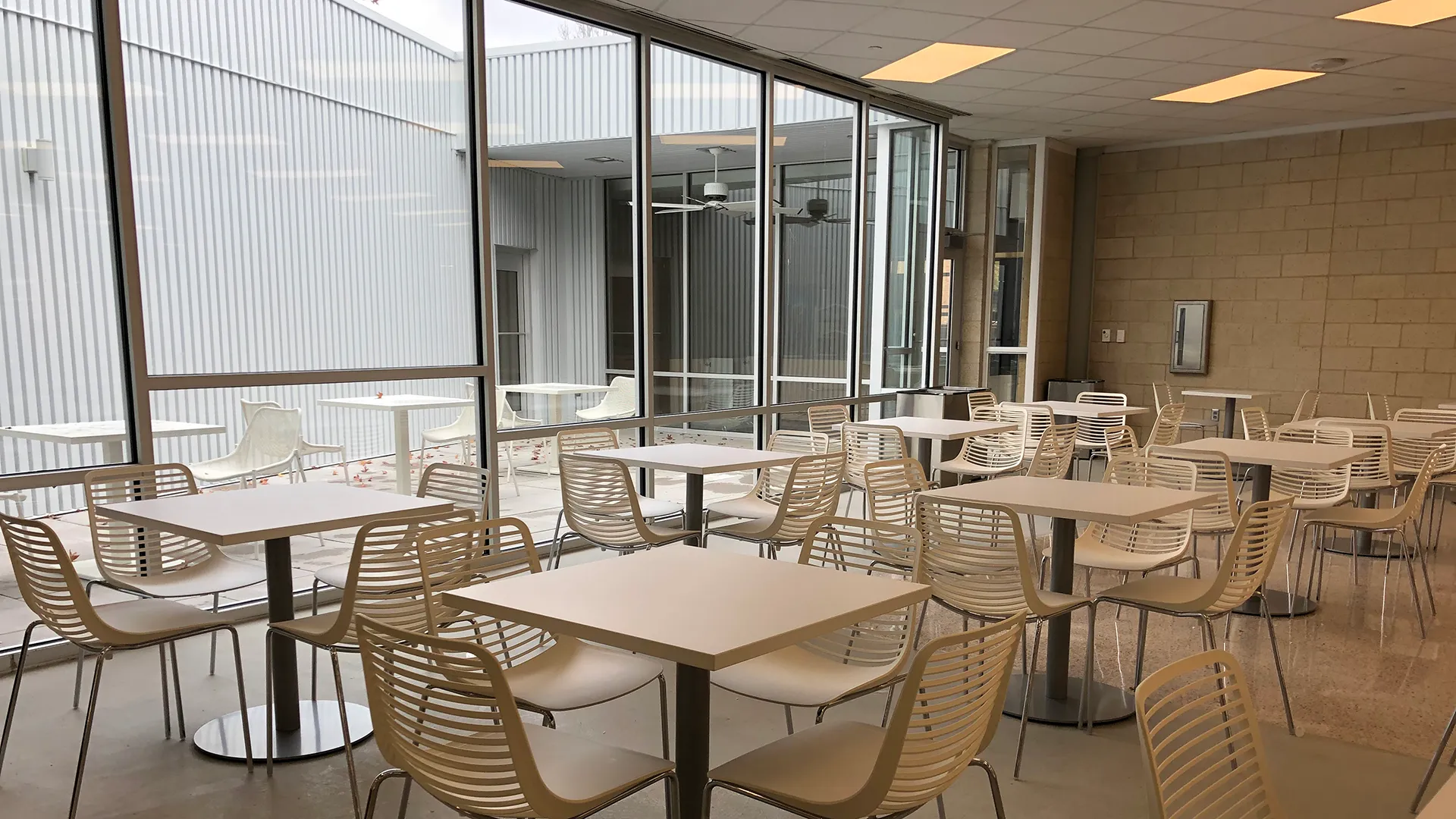 To improve day-lighting in the large, dark seating areas, two interior courtyards were introduced. These small courtyards, concealed from the exterior, serve as large lightwells to the more interior plan, providing transparency, layering, and programmatically-required exterior dining that alleviated the need for walled exterior appendages that would detract from the purity of the original form. Dining rooms and a new 275-seat multipurpose room, with concessions, cluster around these courtyards.