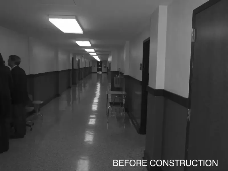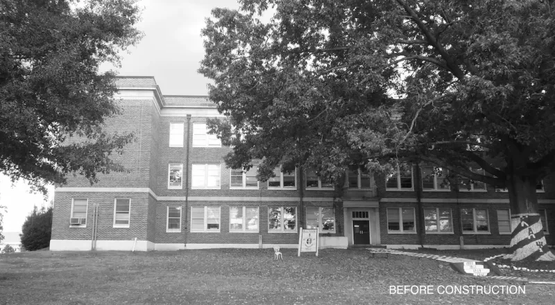 The original two-story school library was transformed into the President’s board/conference room. Exterior scope included restoration of the building envelope: repoint/waterproofing of masonry walls, restoration of cast stone, window frame restoration, and window and door replacement.