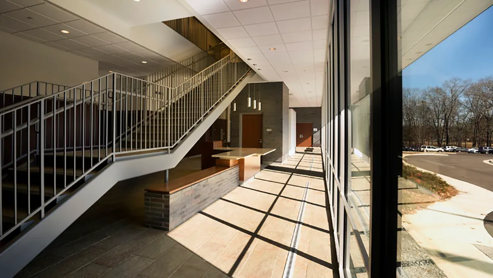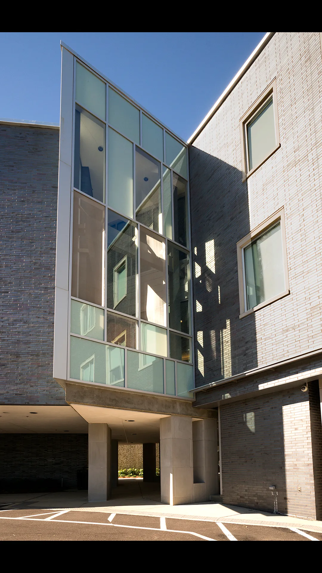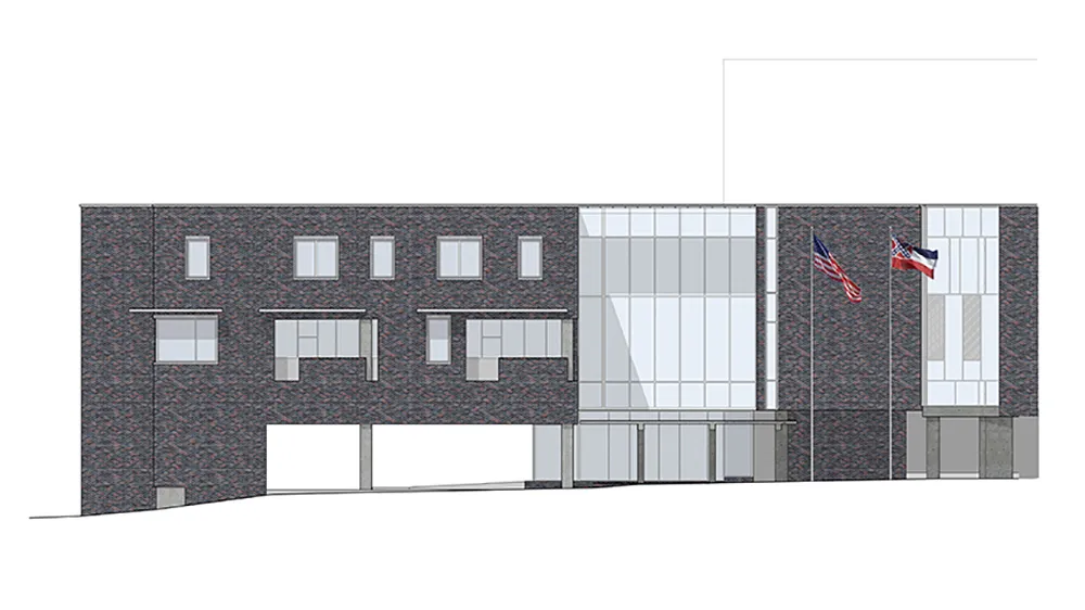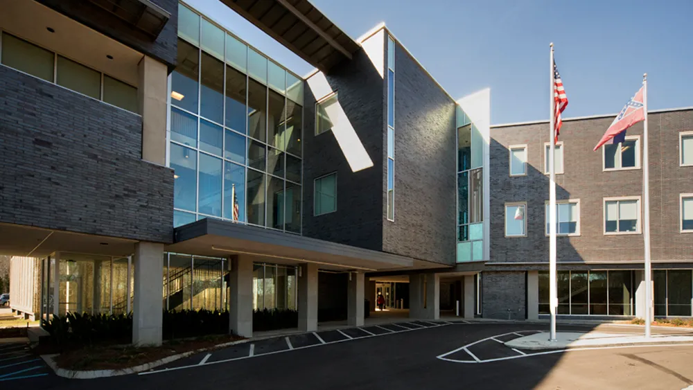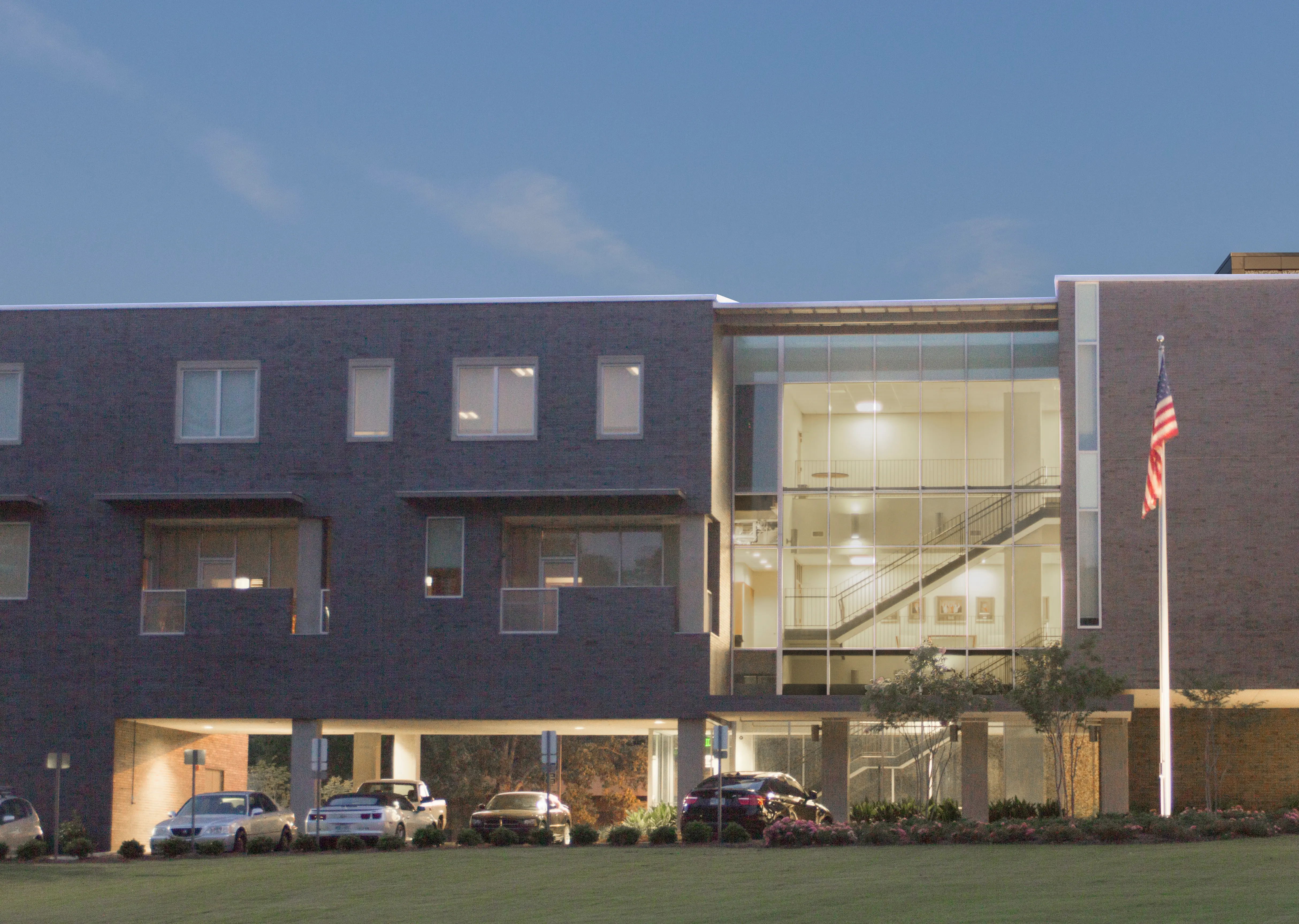 A former corporate office building housed the Mississippi Department of Rehabilitation Services (MDRS) for many years, but did not serve its adapted purpose very well. Its oddly-shaped form, ambiguous entrances and inaccessible level changes made its approach difficult for MDRS employees and clients. The expansion and renovation of the facility required new office areas, a 475-seat auditorium, conference rooms, work areas, and employee areas. Responding to the geometry of the existing building, the design for the addition evolved as two elongated wings that parallel the front angled facades, hugging them close, but separated, creating outdoor spaces between the two buildings and allowing more daylight into the office areas. A new triangular connective element is formed by the new wings, based on the geometry of the existing building form, just in front of the existing building entrance. As a node at the second and third levels, this space connects the existing with the new; it also penetrates the building as a glass balcony, a marquee for a large canopied, floor-level drop-off at the ground floor, where it dissolves into columns, becoming the main entrance plaza. The ground floor becomes a transparent lobby for the auditorium at the north wing, providing an independent entrance. At the south wing, an owner request for an entrance to the executive offices was fulfilled with a curtain-walled glass entrance stair, maintaining the transparency of the ground level. To the west is the new main entrance of glass, opening into the atrium of the renovated building, flooding it with natural light. All new finishes, and a glass rail system replacing the solid-walled guardrails at stairs and landings, contribute to a lighter, more open interior.