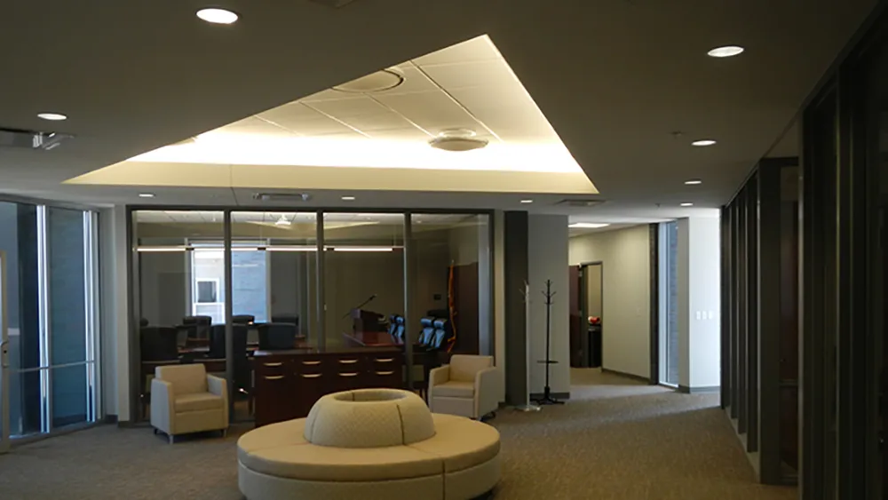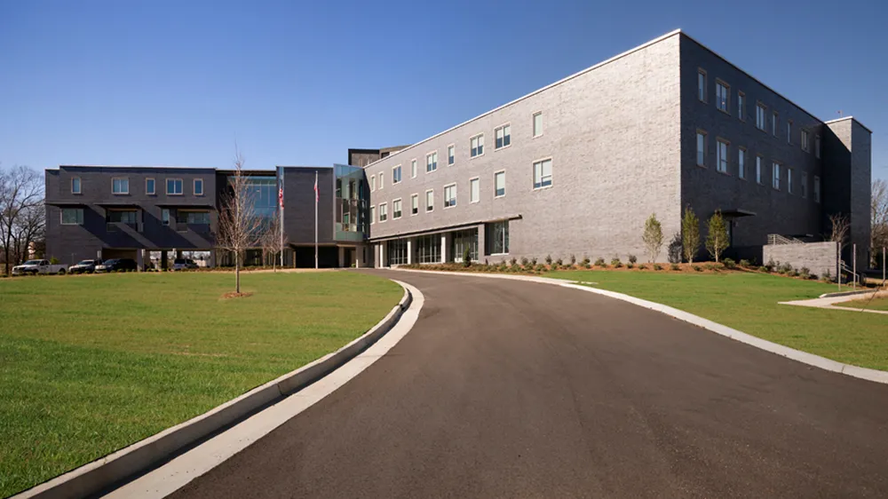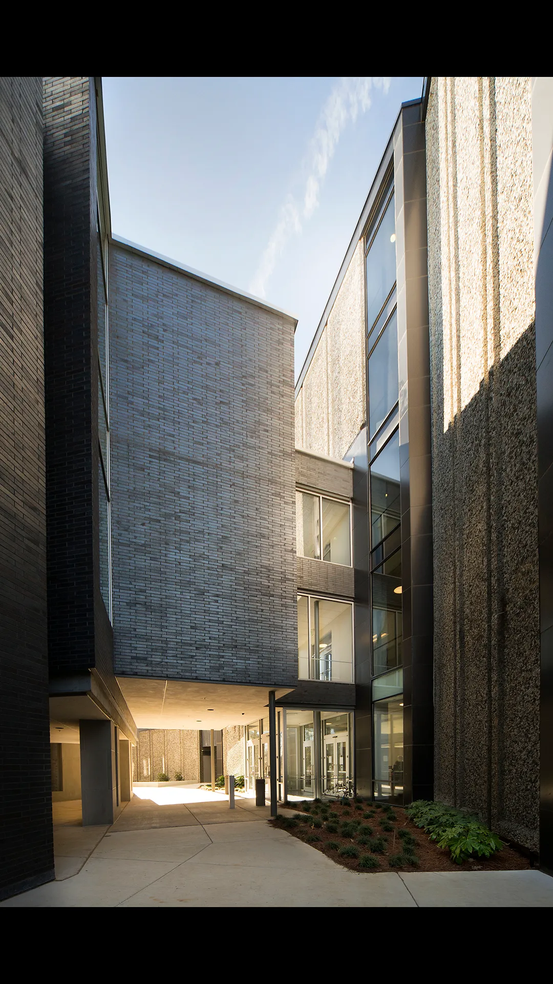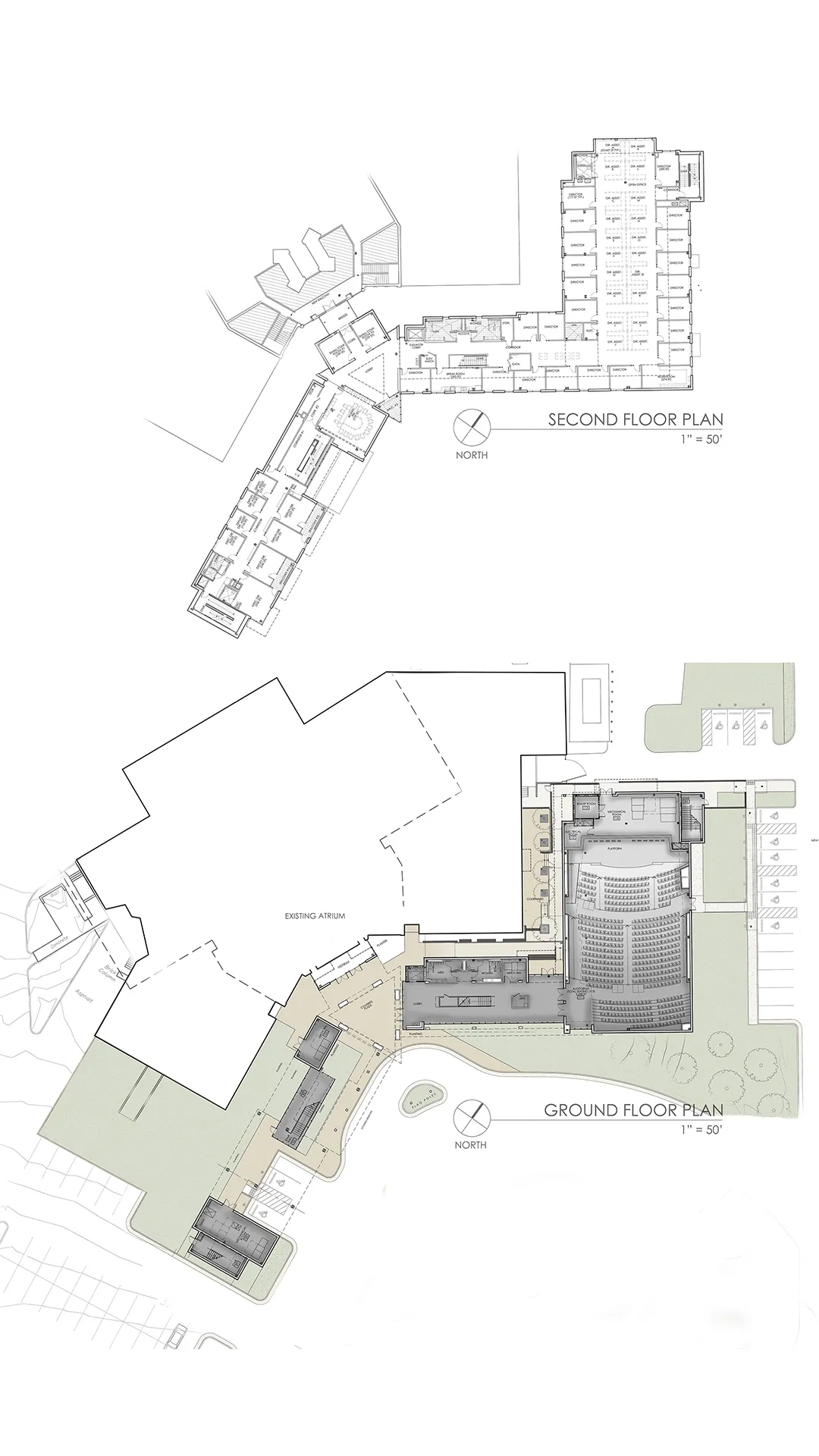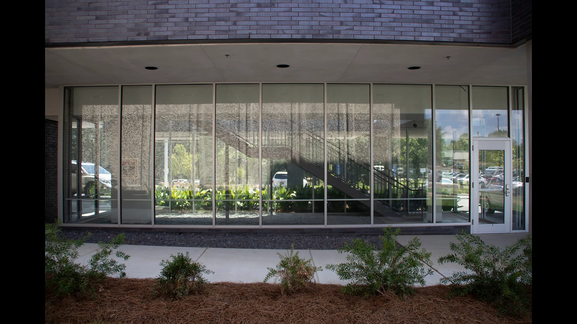 A former corporate office building housed the Mississippi Department of Rehabilitation Services (MDRS) for many years, but did not serve its adapted purpose very well. Its oddly-shaped form, ambiguous entrances and inaccessible level changes made its approach difficult for MDRS employees and clients. The expansion and renovation of the facility required new office areas, a 475-seat auditorium, conference rooms, work areas, and employee areas. Responding to the geometry of the existing building, the design for the addition evolved as two elongated wings that parallel the front angled facades, hugging them close, but separated, creating outdoor spaces between the two buildings and allowing more daylight into the office areas. A new triangular connective element is formed by the new wings, based on the geometry of the existing building form, just in front of the existing building entrance. As a node at the second and third levels, this space connects the existing with the new; it also penetrates the building as a glass balcony, a marquee for a large canopied, floor-level drop-off at the ground floor, where it dissolves into columns, becoming the main entrance plaza. The ground floor becomes a transparent lobby for the auditorium at the north wing, providing an independent entrance. At the south wing, an owner request for an entrance to the executive offices was fulfilled with a curtain-walled glass entrance stair, maintaining the transparency of the ground level. To the west is the new main entrance of glass, opening into the atrium of the renovated building, flooding it with natural light. All new finishes, and a glass rail system replacing the solid-walled guardrails at stairs and landings, contribute to a lighter, more open interior.