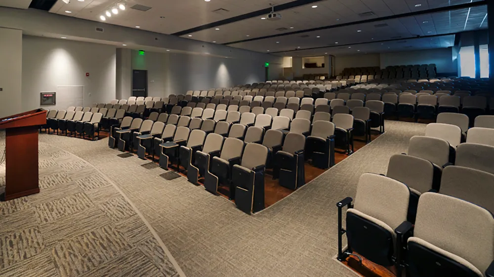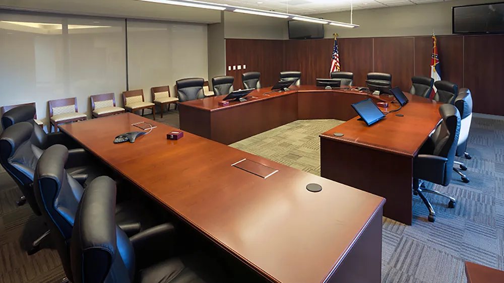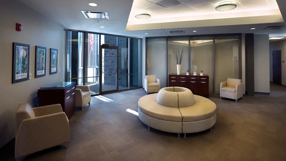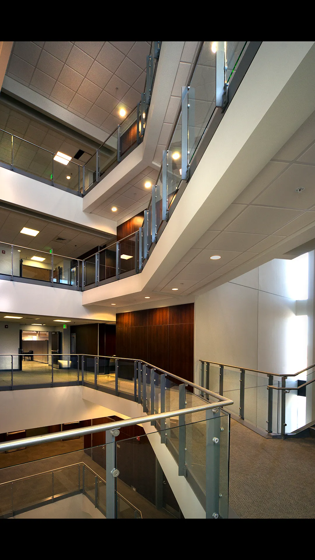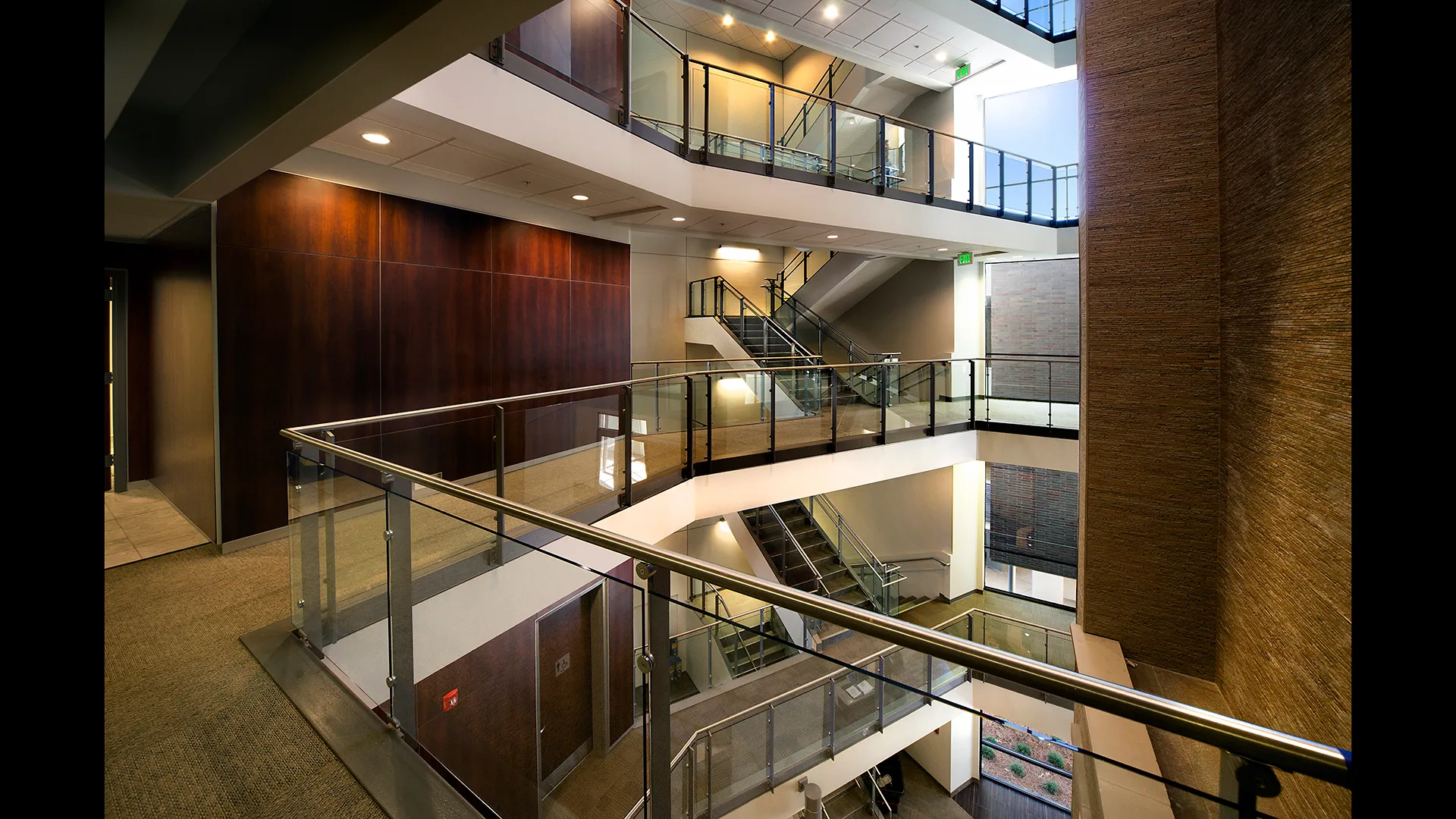 A former corporate office building housed the Mississippi Department of Rehabilitation Services (MDRS) for many years, but did not serve its adapted purpose very well. Its oddly-shaped form, ambiguous entrances and inaccessible level changes made its approach difficult for MDRS employees and clients. The expansion and renovation of the facility required new office areas, a 475-seat auditorium, conference rooms, work areas, and employee areas. Responding to the geometry of the existing building, the design for the addition evolved as two elongated wings that parallel the front angled facades, hugging them close, but separated, creating outdoor spaces between the two buildings and allowing more daylight into the office areas. A new triangular connective element is formed by the new wings, based on the geometry of the existing building form, just in front of the existing building entrance. As a node at the second and third levels, this space connects the existing with the new; it also penetrates the building as a glass balcony, a marquee for a large canopied, floor-level drop-off at the ground floor, where it dissolves into columns, becoming the main entrance plaza. The ground floor becomes a transparent lobby for the auditorium at the north wing, providing an independent entrance. At the south wing, an owner request for an entrance to the executive offices was fulfilled with a curtain-walled glass entrance stair, maintaining the transparency of the ground level. To the west is the new main entrance of glass, opening into the atrium of the renovated building, flooding it with natural light. All new finishes, and a glass rail system replacing the solid-walled guardrails at stairs and landings, contribute to a lighter, more open interior.