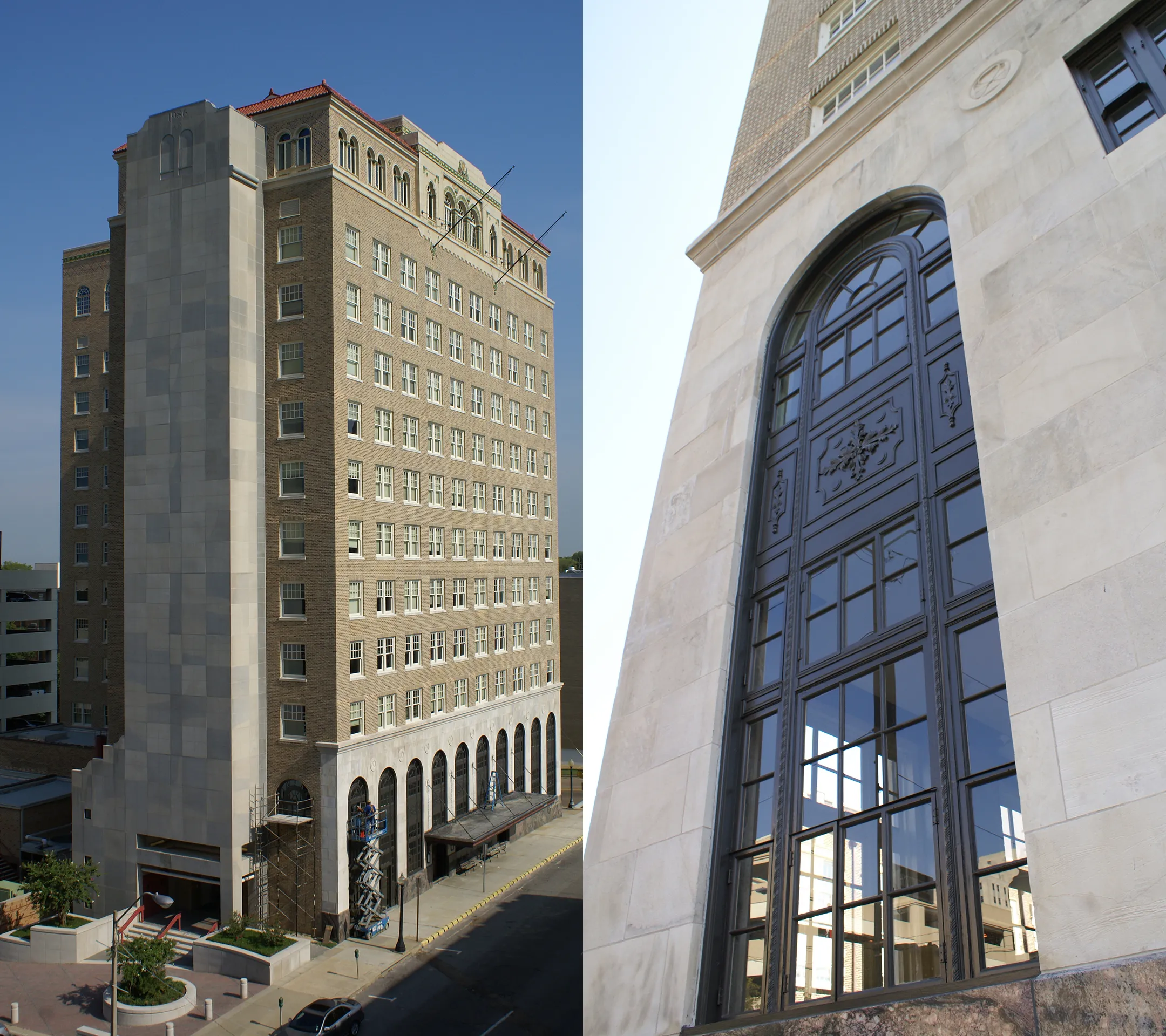 Designed by Mississippi Architect C.H. Lindsley, the Robert E. Lee Building was built in 1928 as a luxury hotel in downtown Jackson, and was later renovated to accommodate State offices in 1969. Although some areas were updated in the late 1980s, the building envelope had not been addressed, and had suffered from water infiltration and deterioration through the years. This project involved the planning and execution of a complete exterior restoration of materials, including brick masonry, glazed terra-cotta ornament and copings, limestone cladding, fenestration, and roofing. A careful and complete analysis of the building’s envelope, including the condition and weather-tightness of its materials, and identification of conditions/locations for full preservation and restoration work was first performed.