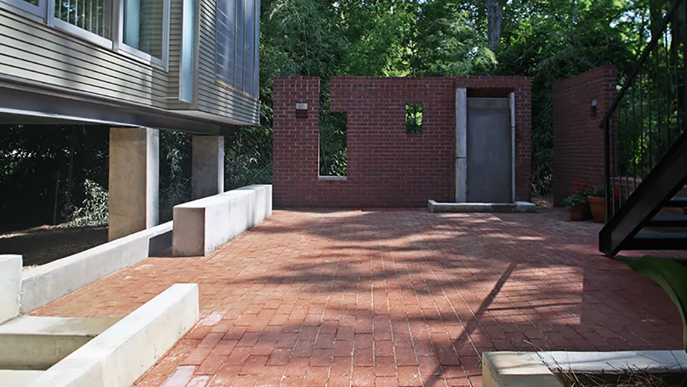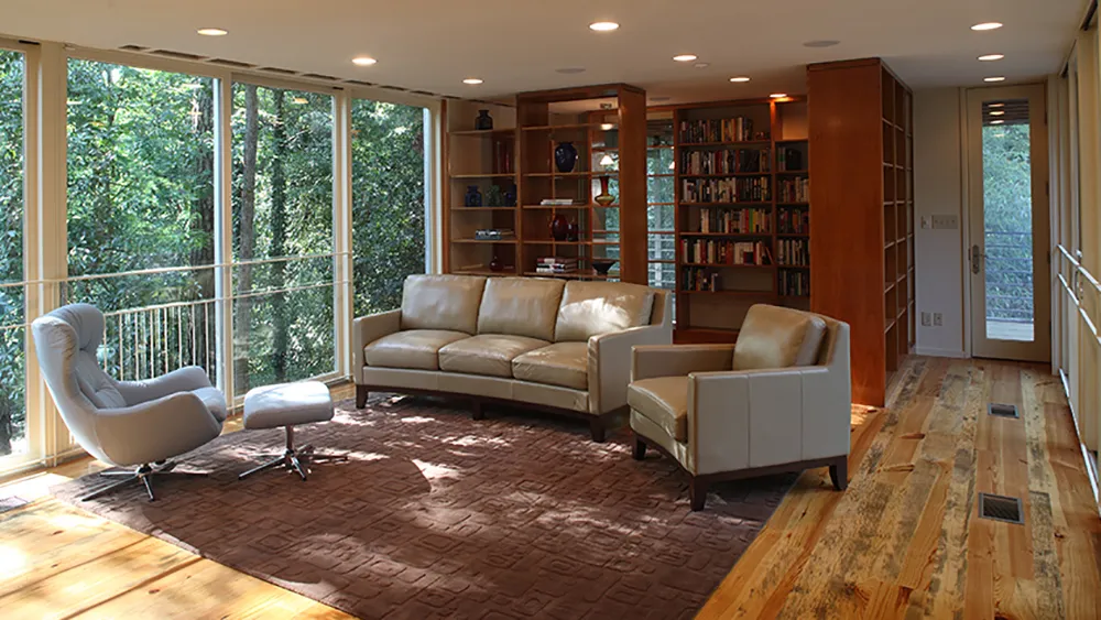 The existing residence, a two-story Tudor Revival with large windows that allowed transparence from the street, overlooked a sloping wooded property trailing to a city park. Primary programmatic concerns for the proposed addition was preserving the transparency of the existing structure, and maintaining views and accessibility to the woods. The solution involved constructing an elevated rectilinear addition, lightly connecting to the existing residence with a double-level bridge.